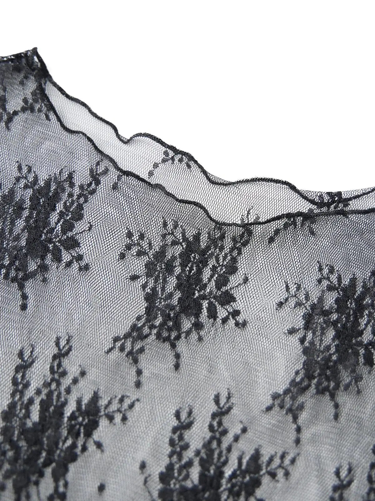 Womens See-Through Lace Dress, Long Sleeve Round Neck Slit Hem Dress Chemise Beach Vacation Party Wear