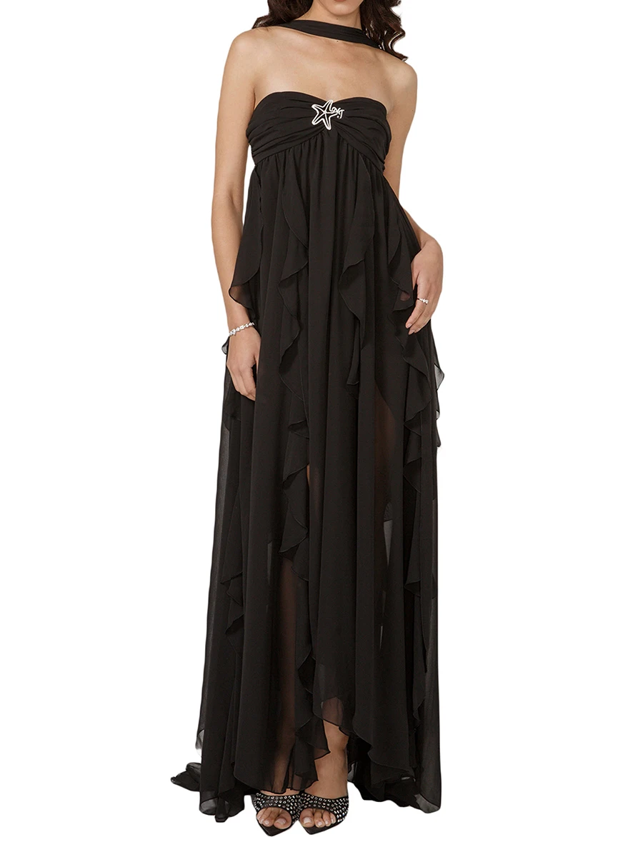 Solid color, ruched bust, decorative stars, halter neck and backless, floor length, irregular ruffled hem design, cocktail party dress, easy to show your charming curves, comfortable for you all day long.